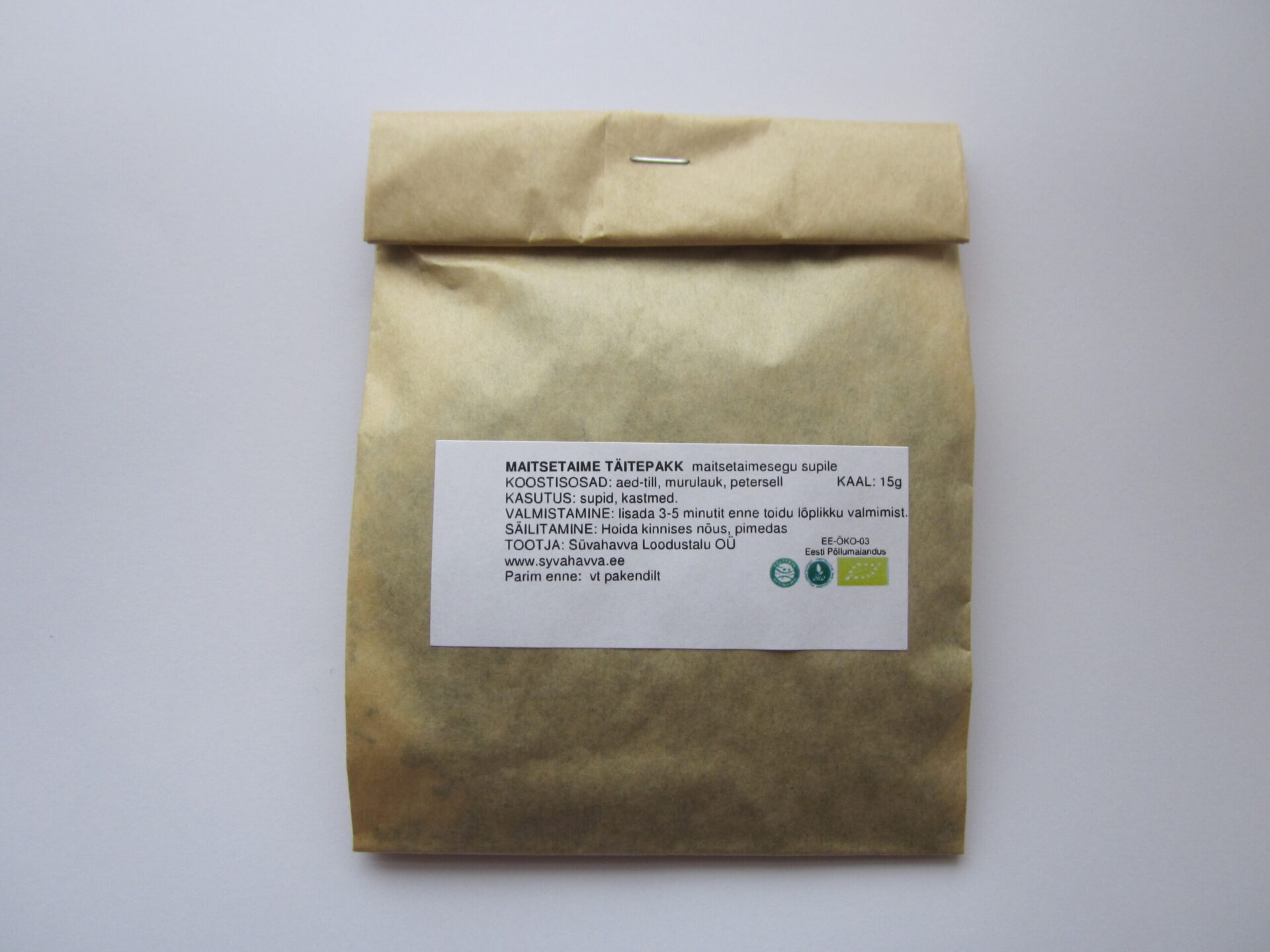 TÄITEPAKK Maitsetaimesegu supile, 15g, mahe KASUTUS: supid Ei ole lisatud soola! Müüja: Süvahavva Loodustalu Hind 1.99 €Poodi